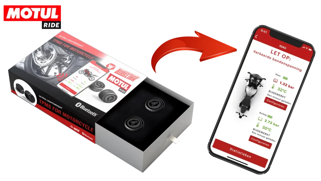 Mit den Motul Ride Reifendrucksensoren ist es möglich, den Reifendruck in Echtzeit (bis auf 1/100 genau) sowie die Reifentemperatur zu messen.